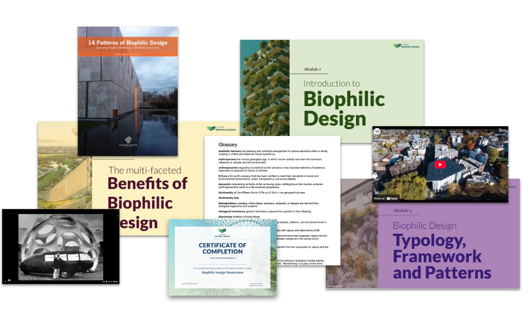 Each module is about 1.5 hours to complete, all focused to help you create spaces and buildings that invite the love of nature.