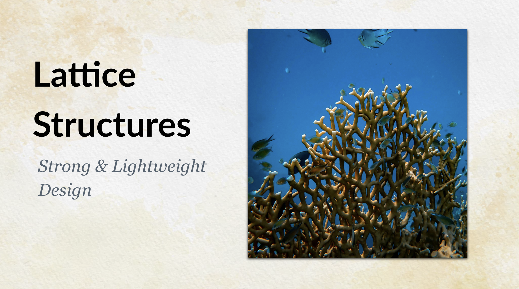 Lattice structures in nature provide strength, flexibility, and efficiency through repeating patterns of interconnected elements. Bird bones have lightweight lattice-like interiors for flight, balancing strength with reduced weight. Sponge skeletons and coral reefs use lattice frameworks for stability and efficient water flow.
