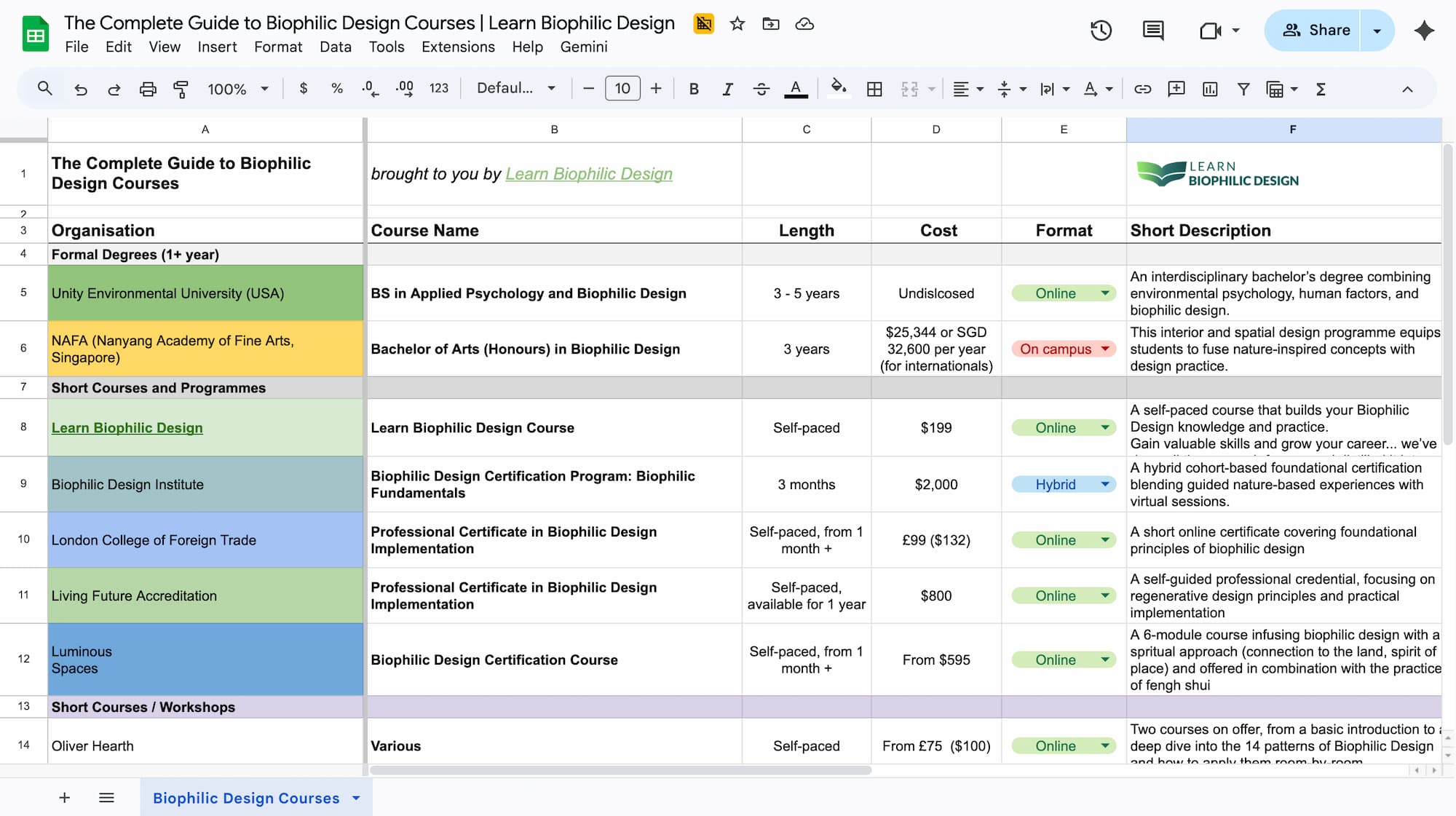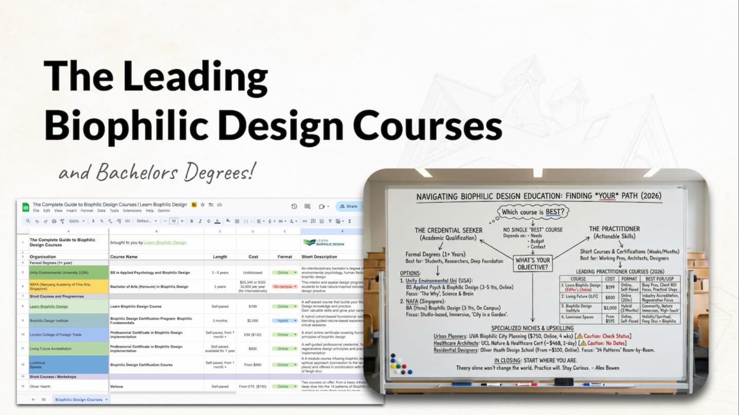 In our research to build the Learn Biophilic Design platform (and beyond our architectural degrees and management of a 120,000+ strong design community), we purchased and studied many of the courses on this list. We noted what worked, and we saw what didn’t. This comprehensive list of all biophilic design courses was part of that research.