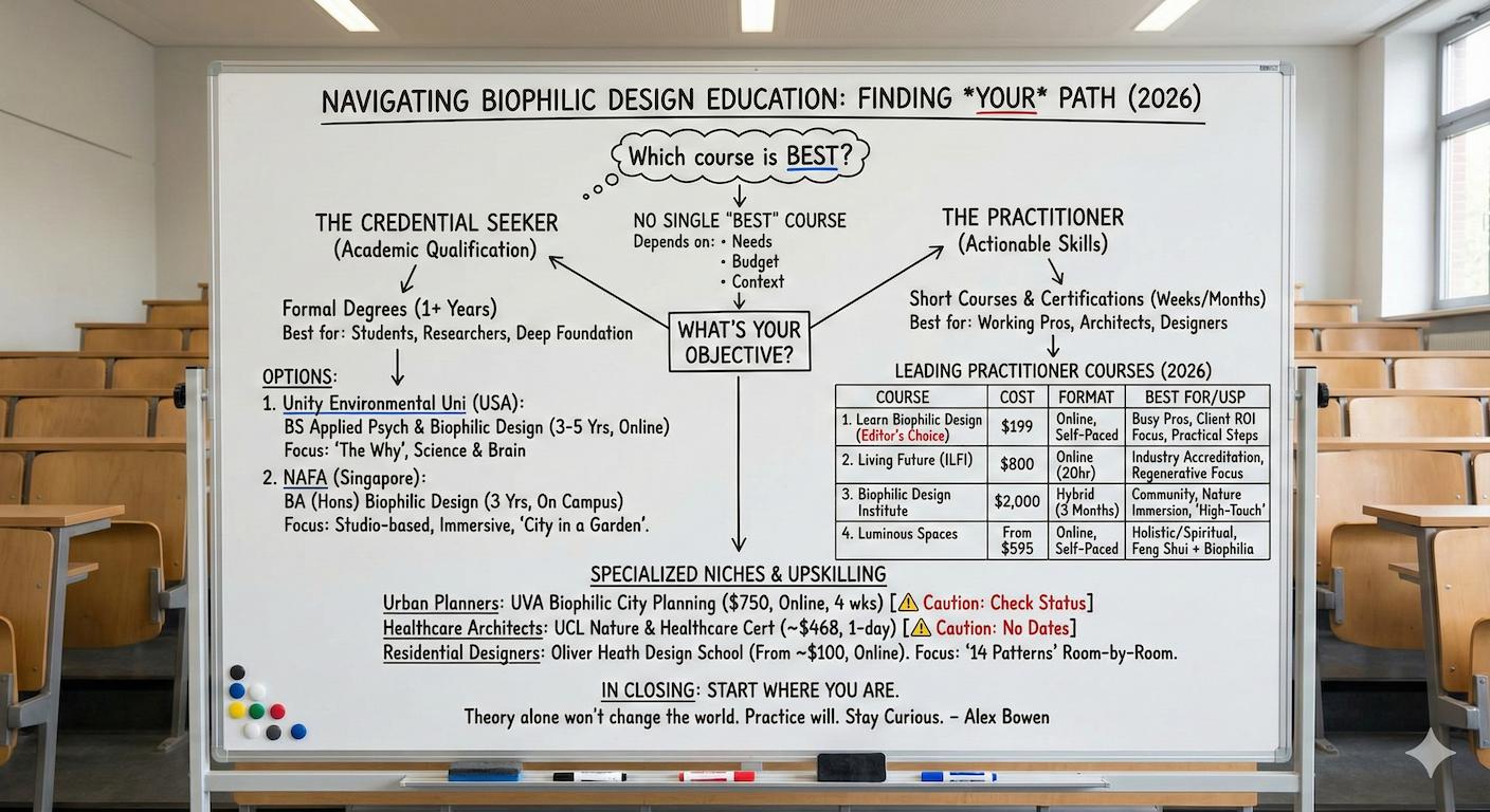 The Biophilic Design Institute offers a hybrid cohort-based certification. It blends virtual sessions with guided nature-based experiences. While the price point is higher, the value lies in the "high-touch" approach and the opportunity to network deeply with a specific cohort of peers.